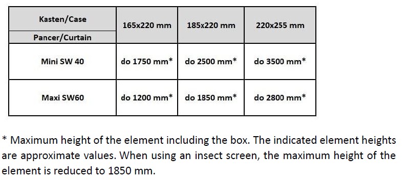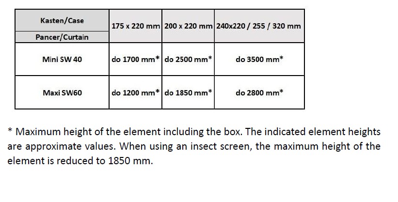 Dimensions of roller shutters with inside and bottom inspection without insect screen
